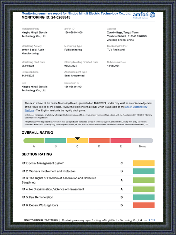 Inden produktbatchet leveres, vil Ningbo Mingli Electric Technology Co., Ltd. også gennemføre en endelig dimensionskontrol for at sikre, at hver batch af produkter opfylder kundens specifikke krav. Dette link skal yderligere sikre konsistensen af dimensionerne fra det første til det sidste produkt og undgå fejl i transport og masseproduktion.